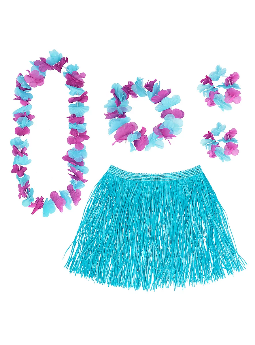 Déguisement de plage cinq pièces Hawaï bleu, avec jupe de raphia artificiel, collier, bandeau et deux brassards ornés de fleurs pour une ambiance tropicale !