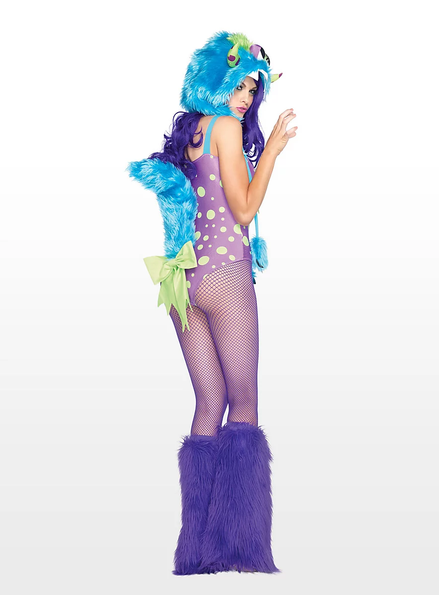 le déguisement de monstre sexy est composé d’un maillot une pièce à points violet-vert avec des bretelles néon bleu et un volant dentelé au décolleté. Le body est dans une matière élastique brillante qui épouse parfaitement la silhouette. Le décolleté est profond et un nœud néon vert au milieu l’accentue à l’endroit parfait. Au dos du déguisement, la queue en fourrure artificielle velue de la Monster Lady attire les regards avec un gros nœud néon vert. Elle est conçue avec un fil de fer intégré et un ruban de sorte qu’elle peut être fixée au déguisement et prendre la forme désirée. Ce monstre sexy porte sur la tête un bonnet en fourrure artificielle néon bleu avec de gros yeux globuleux, de petites cornes et une rangée de dents pointues. Le couvre-chef frappant a en outre de longs pompons qui rappellent la forme de petites pattes. Afin que le monstre en peluche sexy n’ait pas les pieds froids, il est équipé de guêtres montant jusqu’aux genoux en fourrure artificielle violette. Celles-ci sont conçues avec un élastique pratique et peuvent être enfilées de façon aisée sur les chaussures. Déguisement extravagant pour celles parmi nous qui veulent montrer à Halloween ou à la prochaine fête que les monstres peuvent aussi avoir beaucoup de sex-appeal !