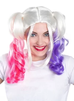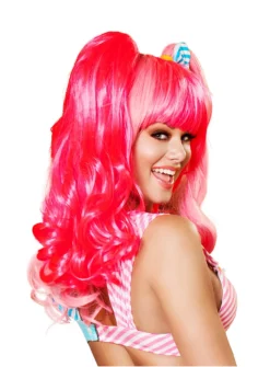 Perruque Bouclée Rose Fluo Avec Couettes Amovibles