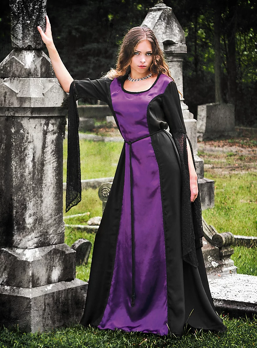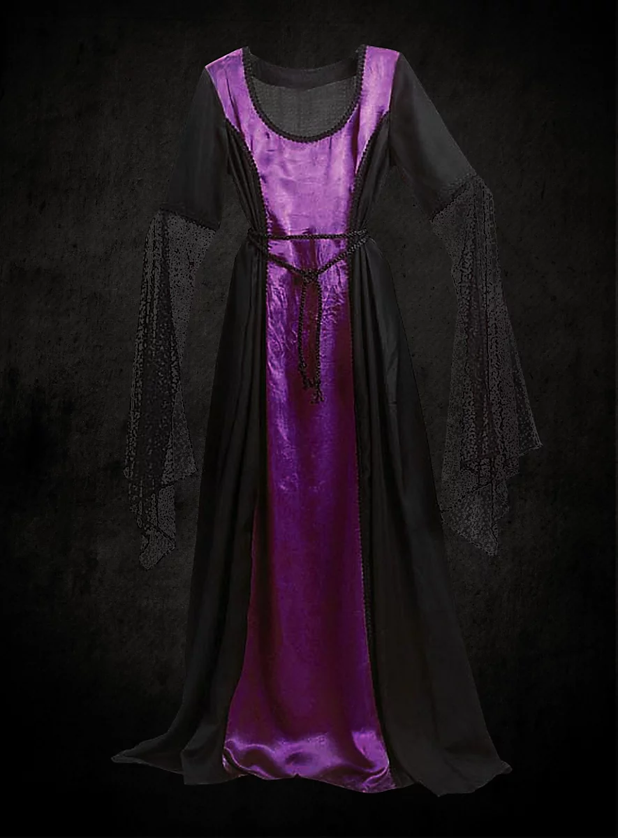Cette robe légère et vaporeuse de style gothique est spectaculaire et élégante. Elle attire tous les regards grâce à l’empiècement contrastant en satin sur le devant, entouré par des galons et aux très longues manches fendues en dentelle noire. Une longue cordelette autour de la taille complète cette impressionnante robe de vampire.