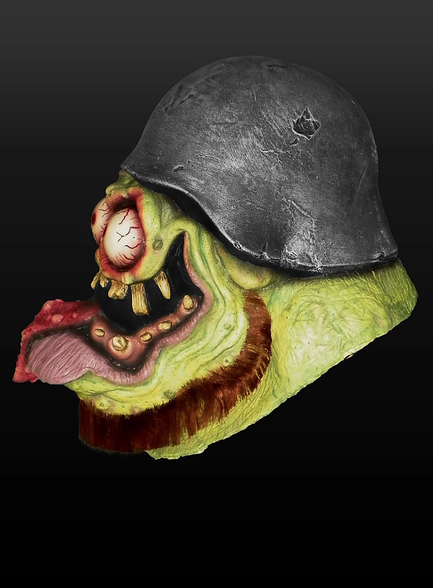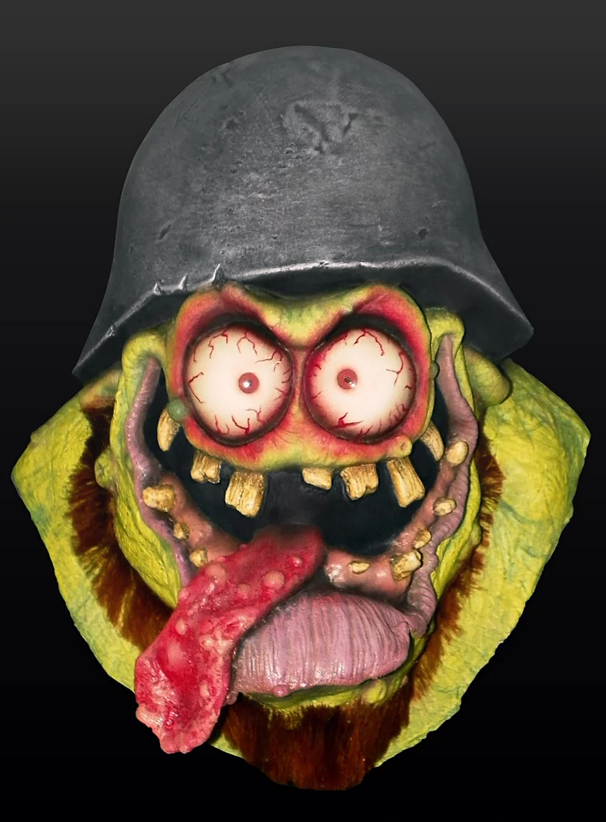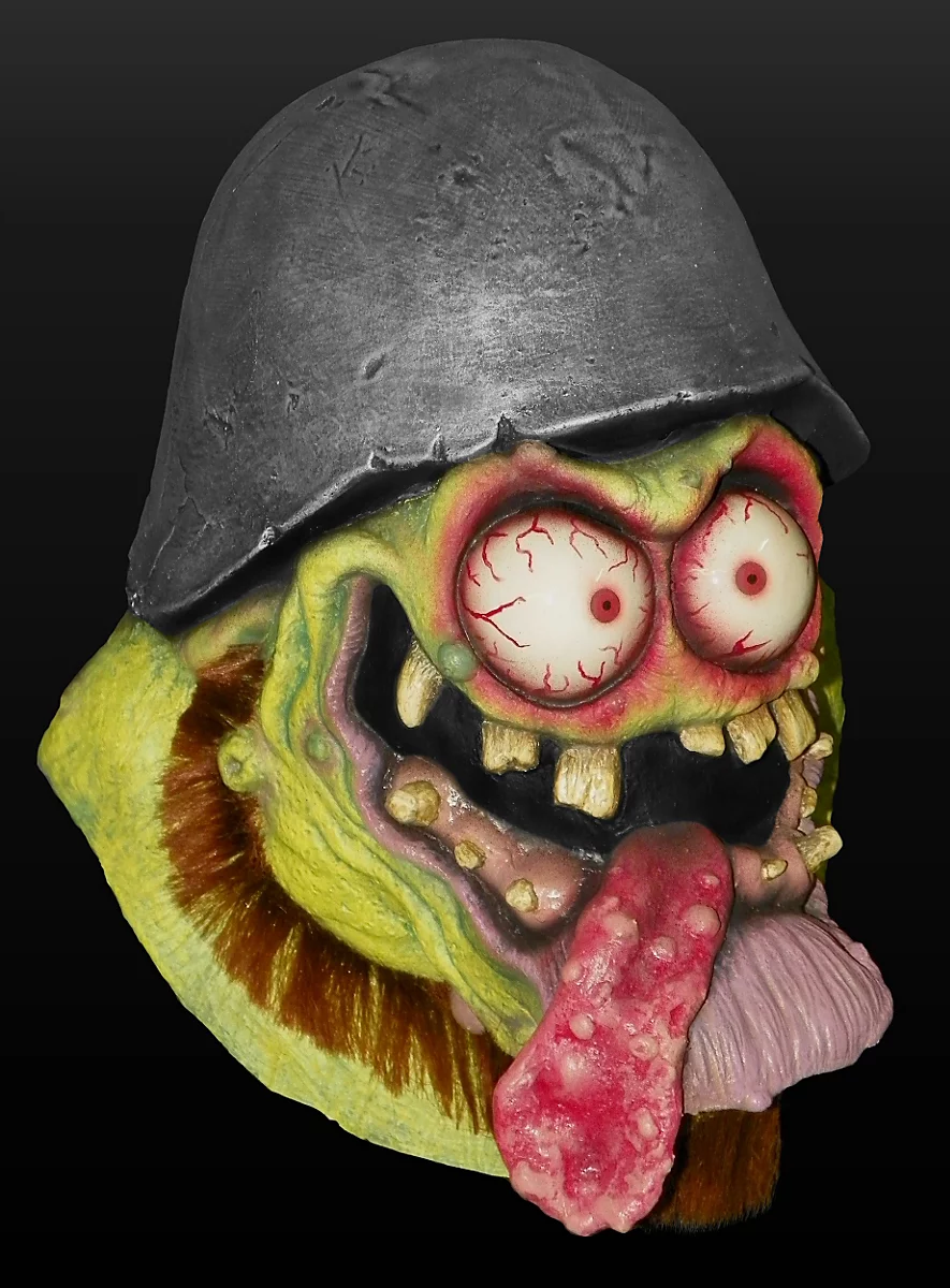 Avec son complice Frankenfink, le Surf Kook des studios Johnny Ace profite de la vie et de ses énergies criminelles. Ce masque du biker monstre rustre est vraiment authentique avec un casque en acier, des yeux globuleux, des chicots pourris et une langue pendante. La barbe est en poils artificiels marron rouge. Le masque entier surtaillé en latex est richement peint à la main. Un rembourrage en mousse à l’intérieur assure un bon confort de port. Ensuite, on vous met sur un Chopper, Frankenfink déboule et sévit dans les environs !